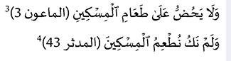 (4) അവര് (കുറ്റവാളികള്) മറുപടി പറയും: ഞങ്ങള് നമസ്കരിക്കുന്നവരുടെ കൂട്ടത്തിലായില്ല. (നരകാവകാശികളായി തീര്ന്ന ആളുകള് എന്തുകൊണ്ട് നരകത്തില് പ്രവേശിക്കപ്പെട്ടു എന്ന ചോദ്യത്തിന് നല്കുന്ന മറുപടിയാണ് ഈ വചനത്തിലുള്ളത്)